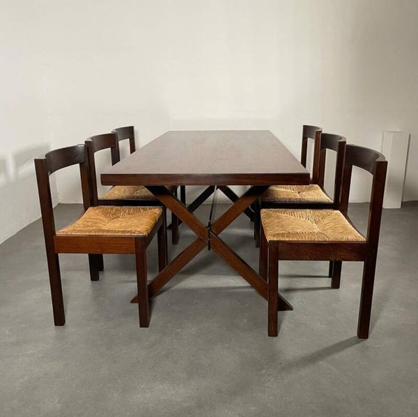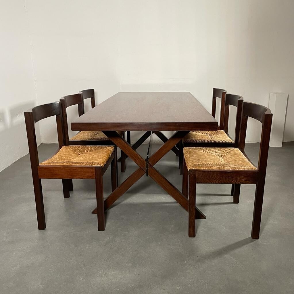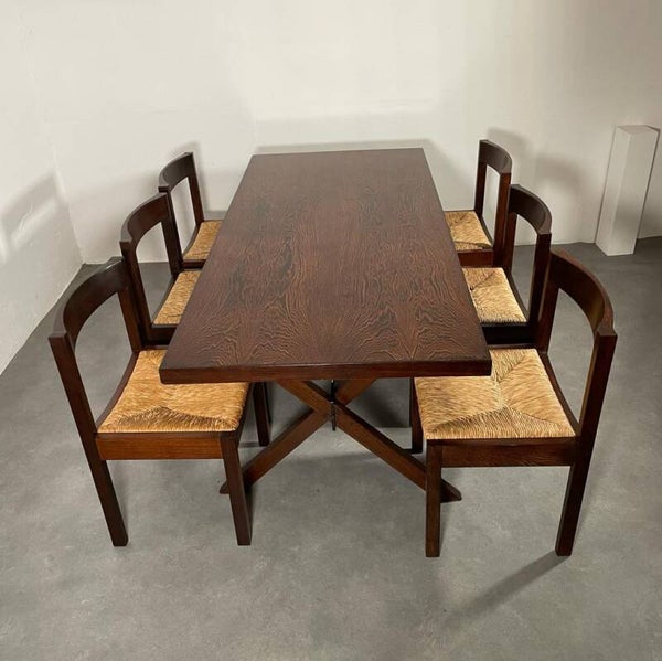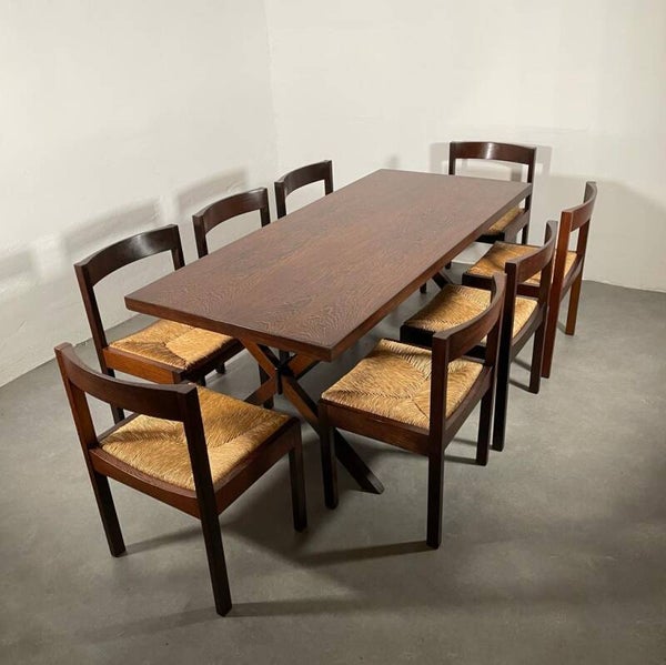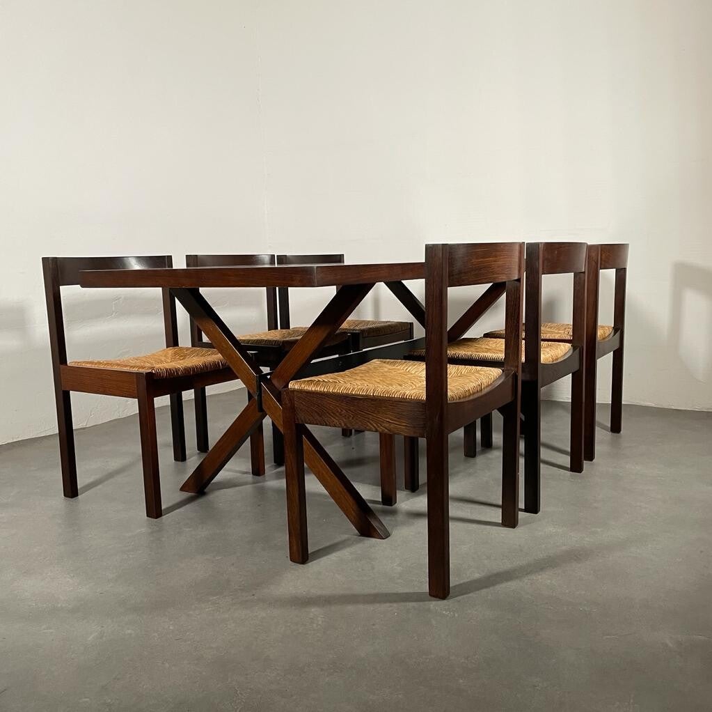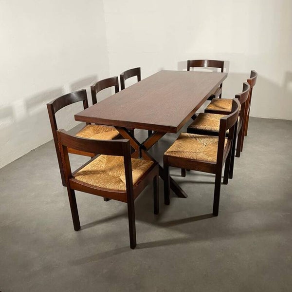 Mooie gerestaureerde set. 8 massief wengé stoelen met rieten zittingen geplaatst om een wengé tafel met wengé poten een een zwart metalen midden balk. Gerard geytenbeek for AZS meubelen, 1960's.