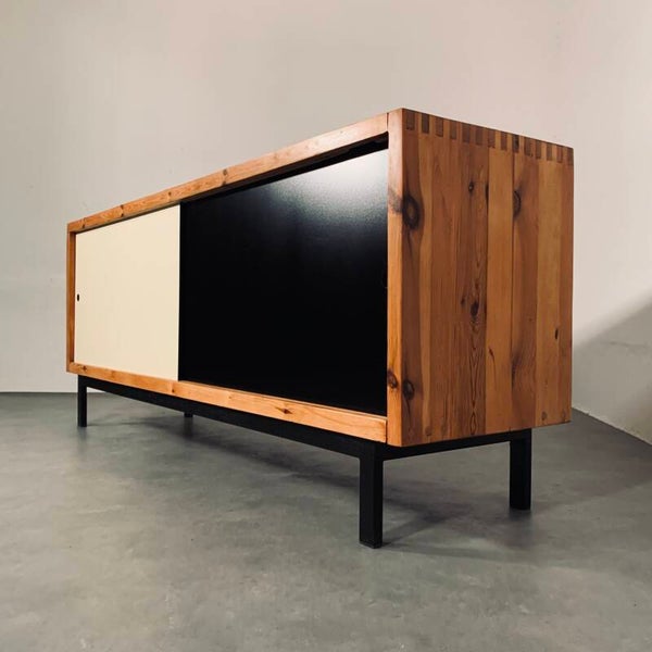 Restored pine sideboard attrib. to Ate van Apeldoorn. Bautiful drawing in the wood nice patine. Two sliding doors with one side white other side black. So front can be changed, all white, all black or black & white, as can be seen in the picture.