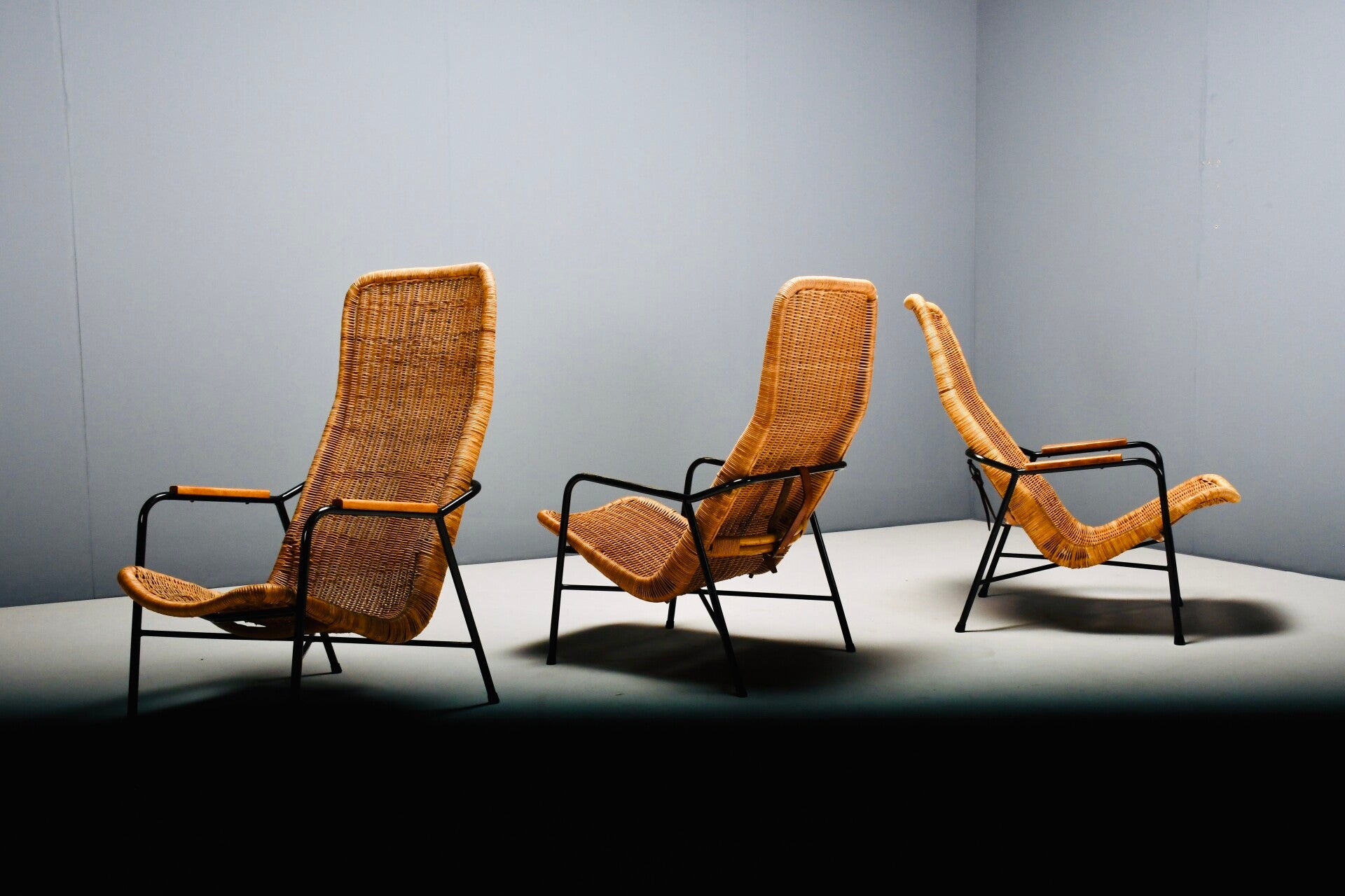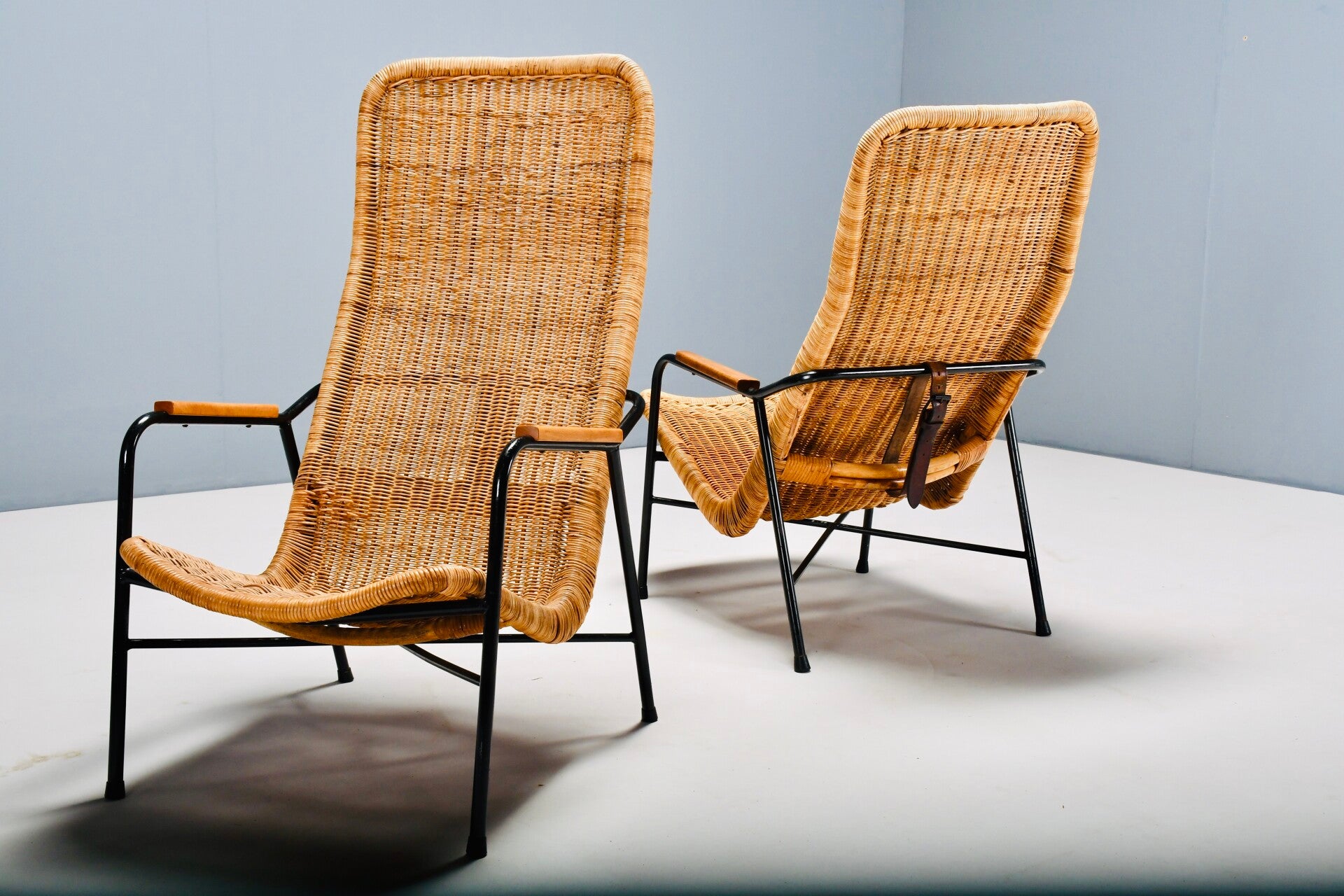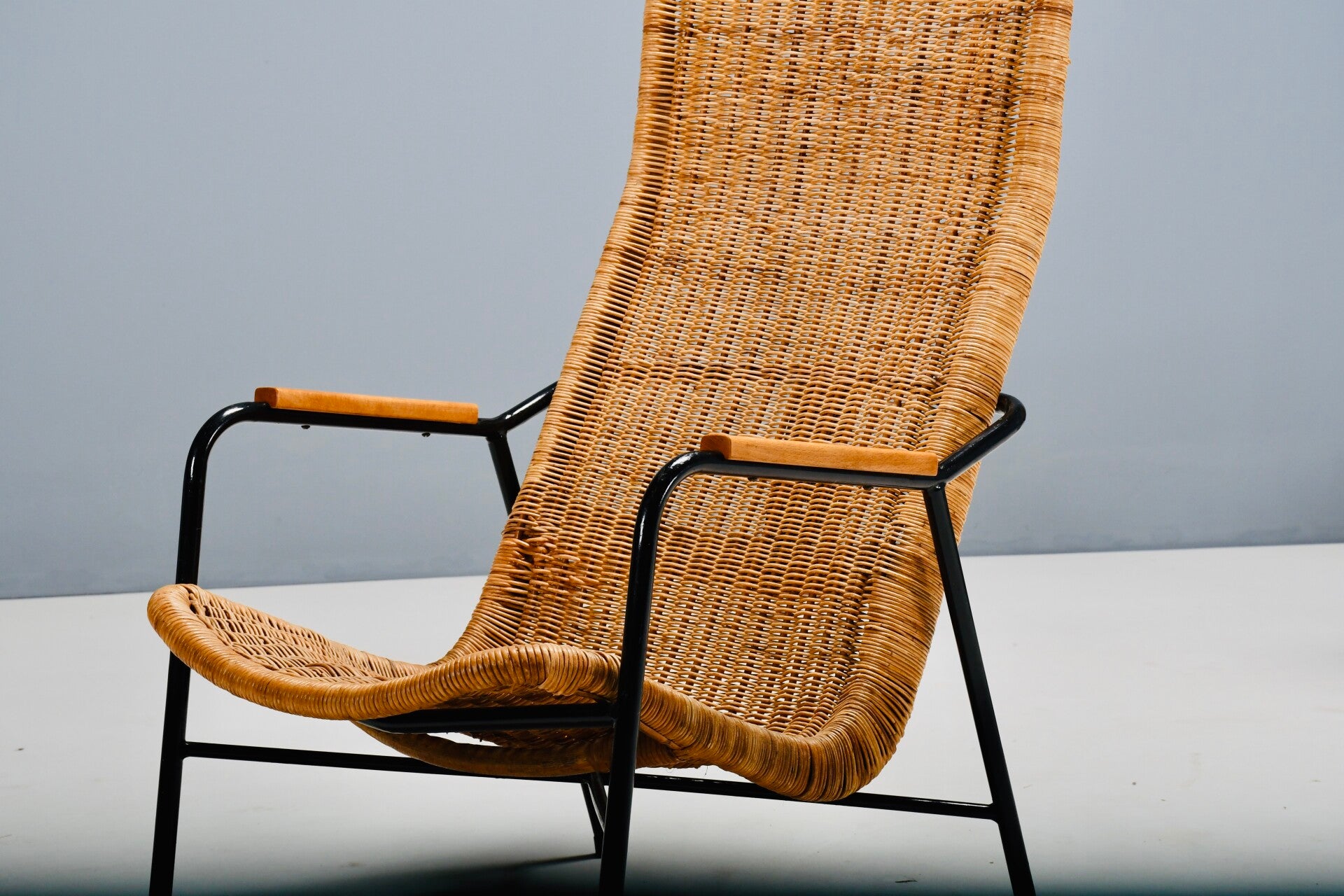 The 514a belt chair by Dirk van Sliedregr for 'Gebroeders Jonkers', Noordwolde, Netherlands, 1952. Black steel frame with ash armrests and rattan basket. A leather strap allows the basket to be cleverly adjusted to the correct angle for comfort.
