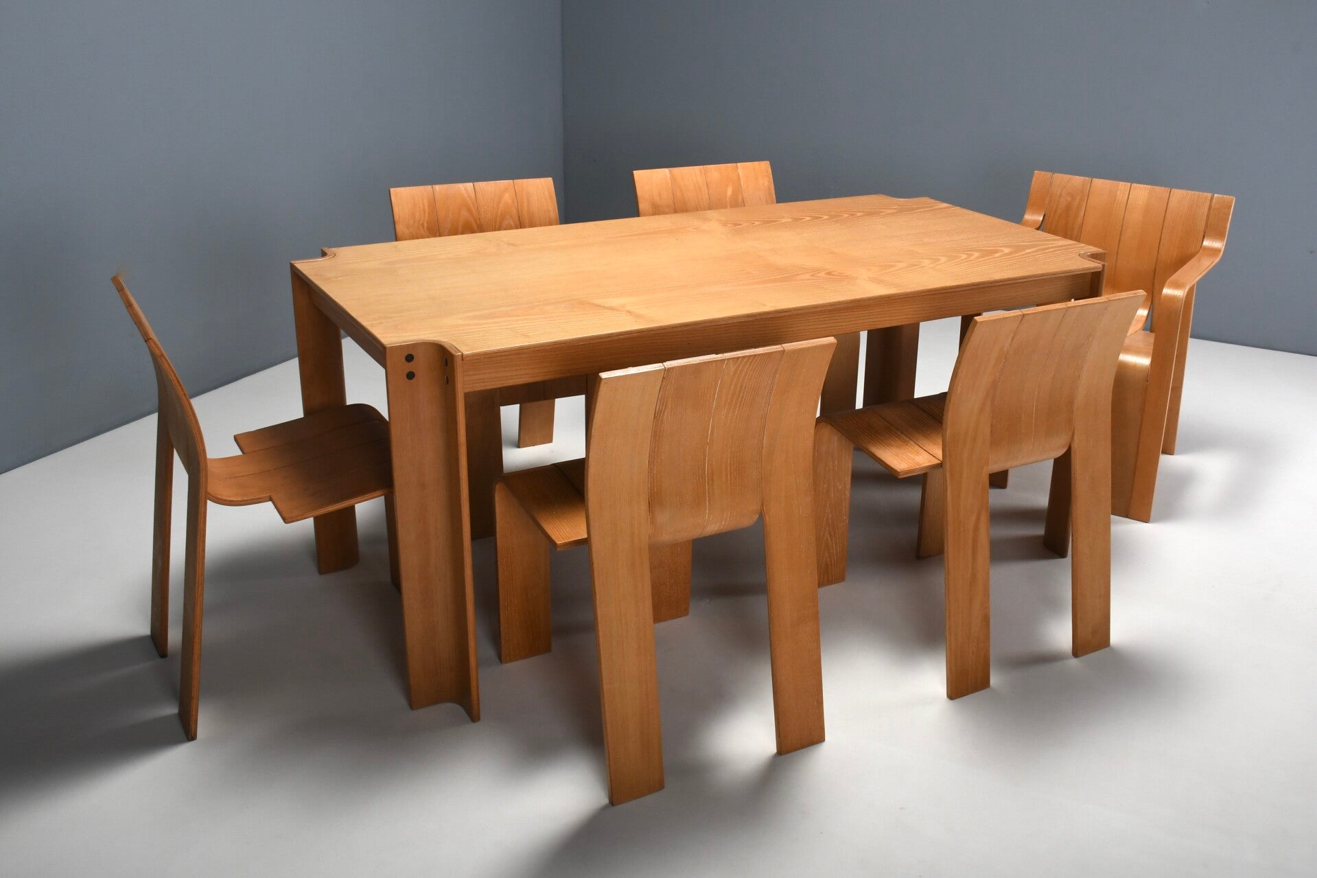 Eetkamerset, bestaande uit zes essenhouten stoelen met bijbehorende tafel , ontwerp Gijs Bakker 1974, uitvoering Castelijn 1974
